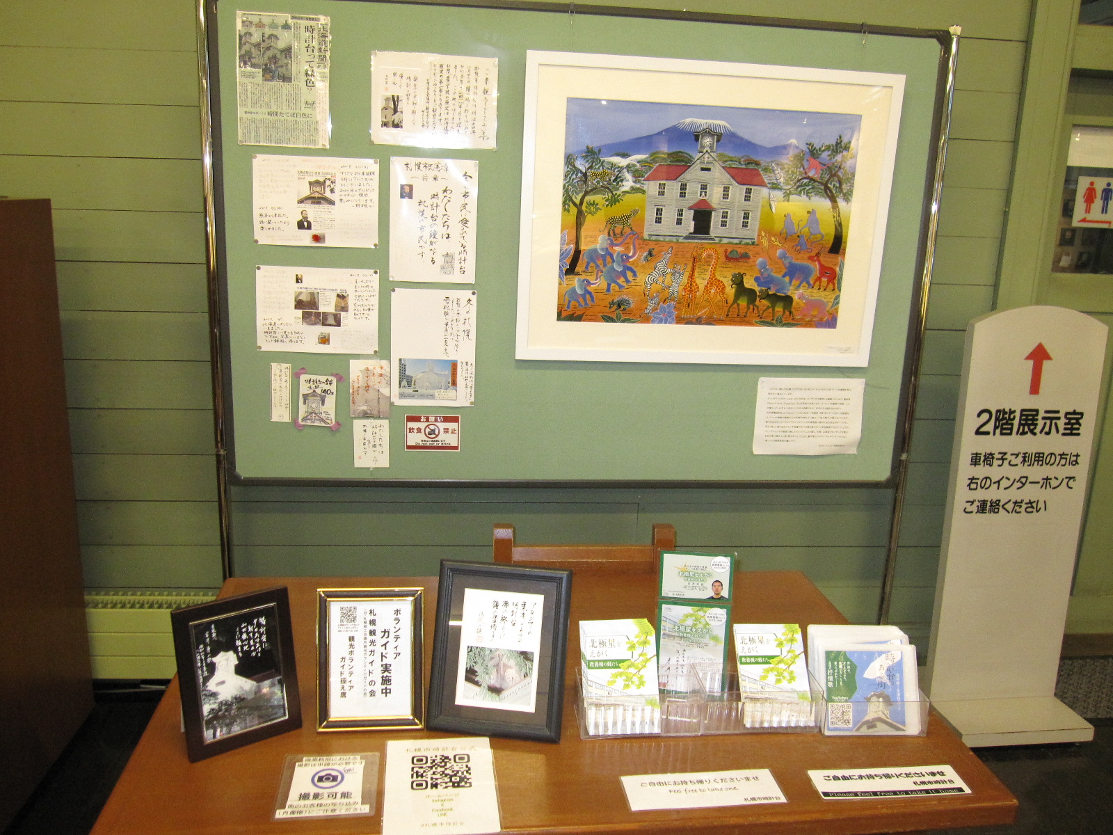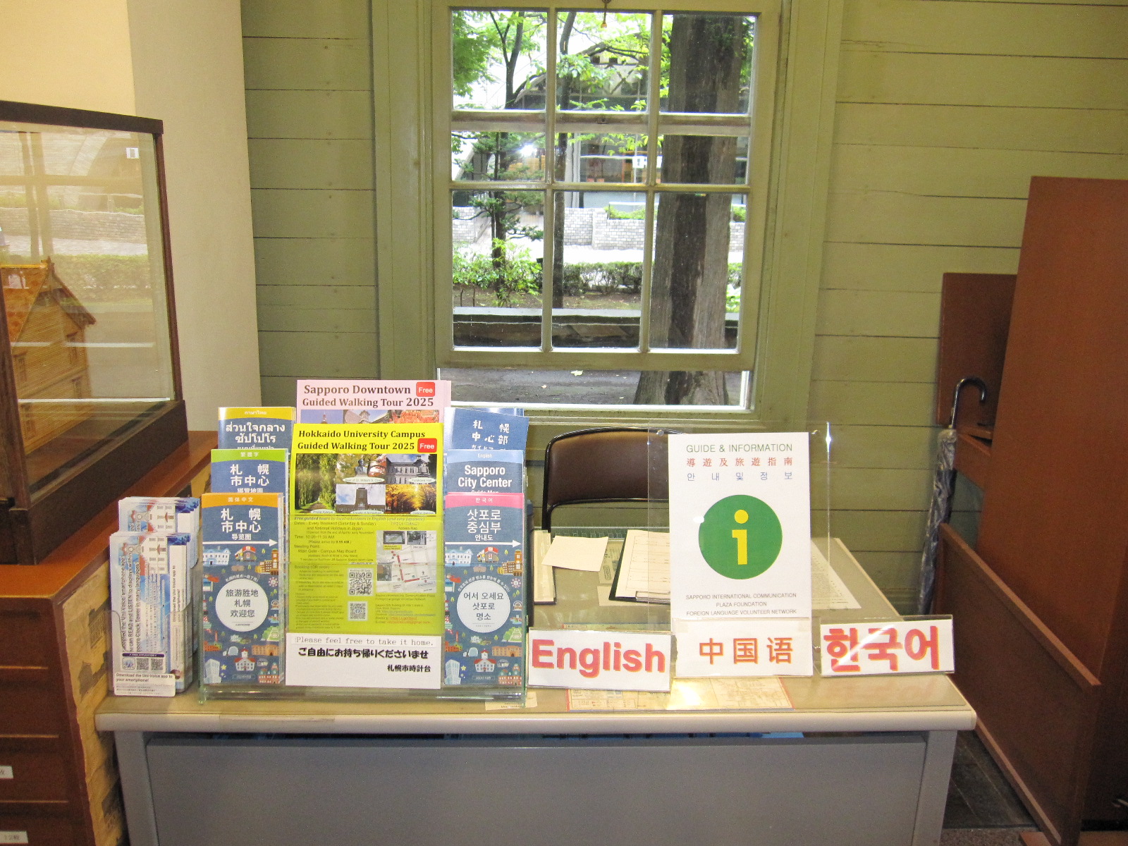 大展示室奥に札幌観光ボランティア様の受付机があり日々活動されております。歴史の裏話など興味深いお話をされてます